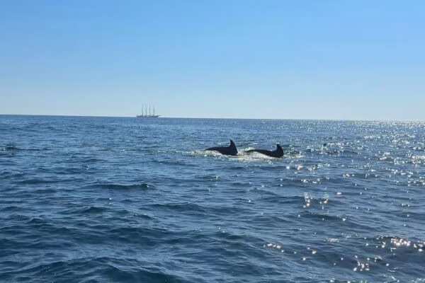 After about 45 minutes, during which time a Tall Ship on the distant horizon became ever closer, the skipper cut the engines, the bow sunk, and before us was another tourist boat surrounded by dolphins.