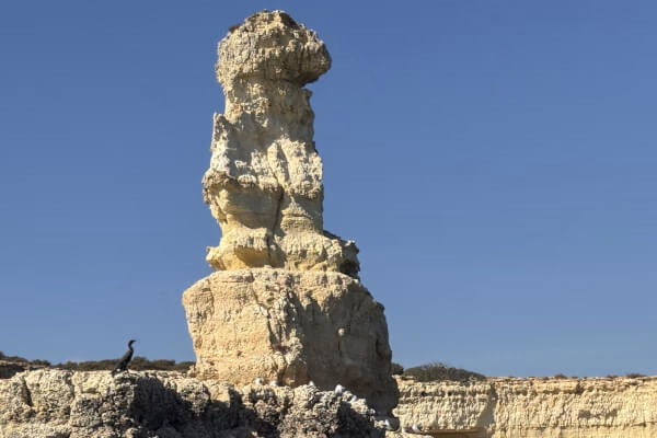 From the cave we gently motor back down this part of the coast exploring, from more disance, other caves and beaches, as well as The Thiefs Stack (Leixão do Ladrão), where we are delighted to see a cormorant resting by its side.