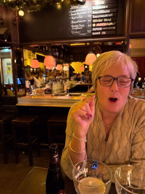 On top of that, the bars and restaurants are simply amazing and multitudinous. We both love a dark beer, and Belgian and Dutch versions are found everywhere, and all with their own special glass. It really is fun discovering new ones, many that you never hear of in England, some that you find in Waitrose (Nikki has a standing order for Westmalle every week).